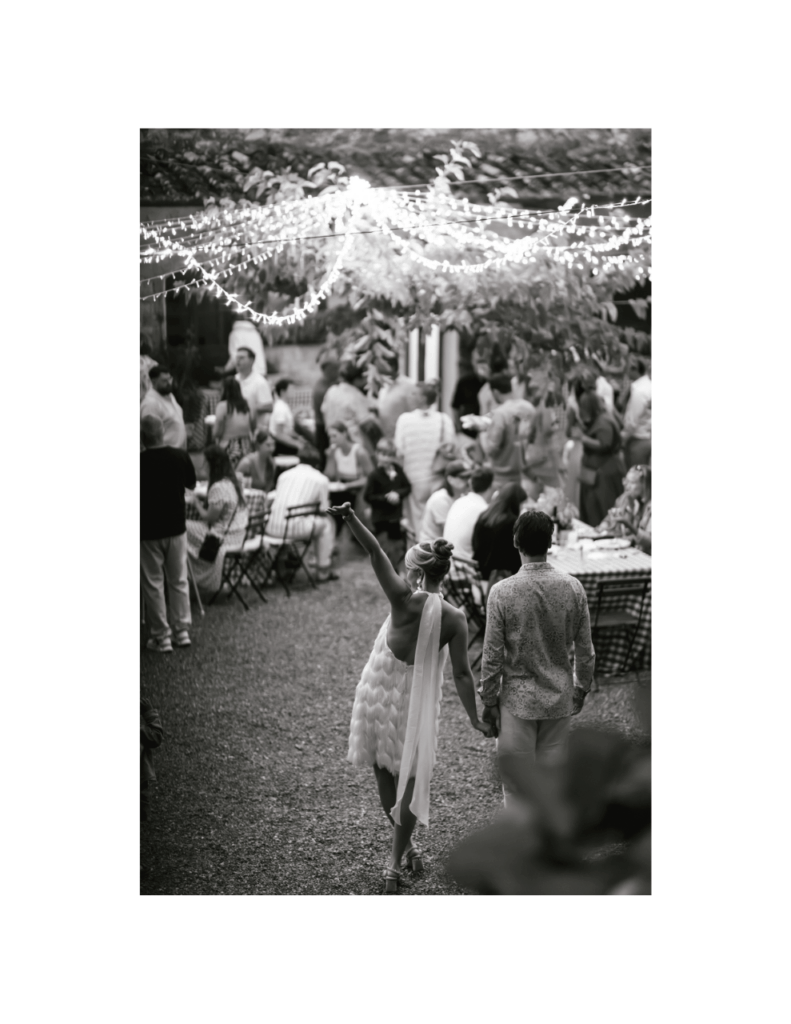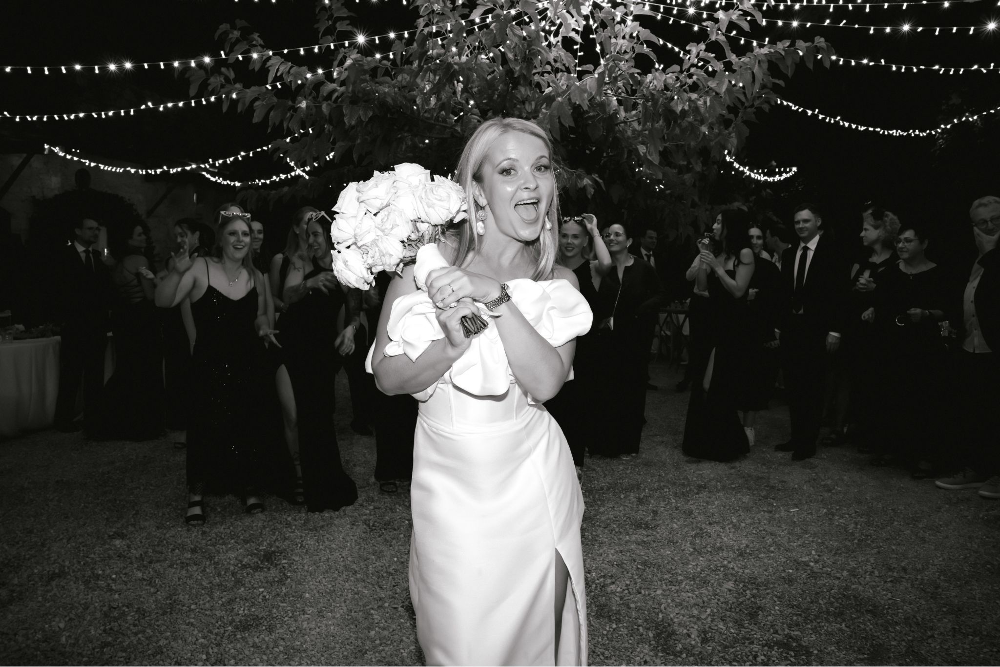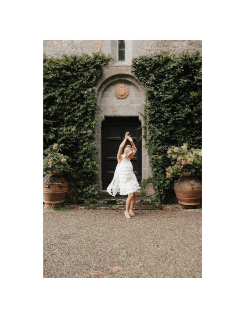 Während der Dresscode “All Black elegant” für alle Gäste Schwarz lautete, strahlte das Brautpaar in Weiß. Am Vorabend trug Isabel ein kurzes Fransenkleid – verspielt, chic und ideal für die ungezwungene Pizzaparty unter toskanischem Himmel.